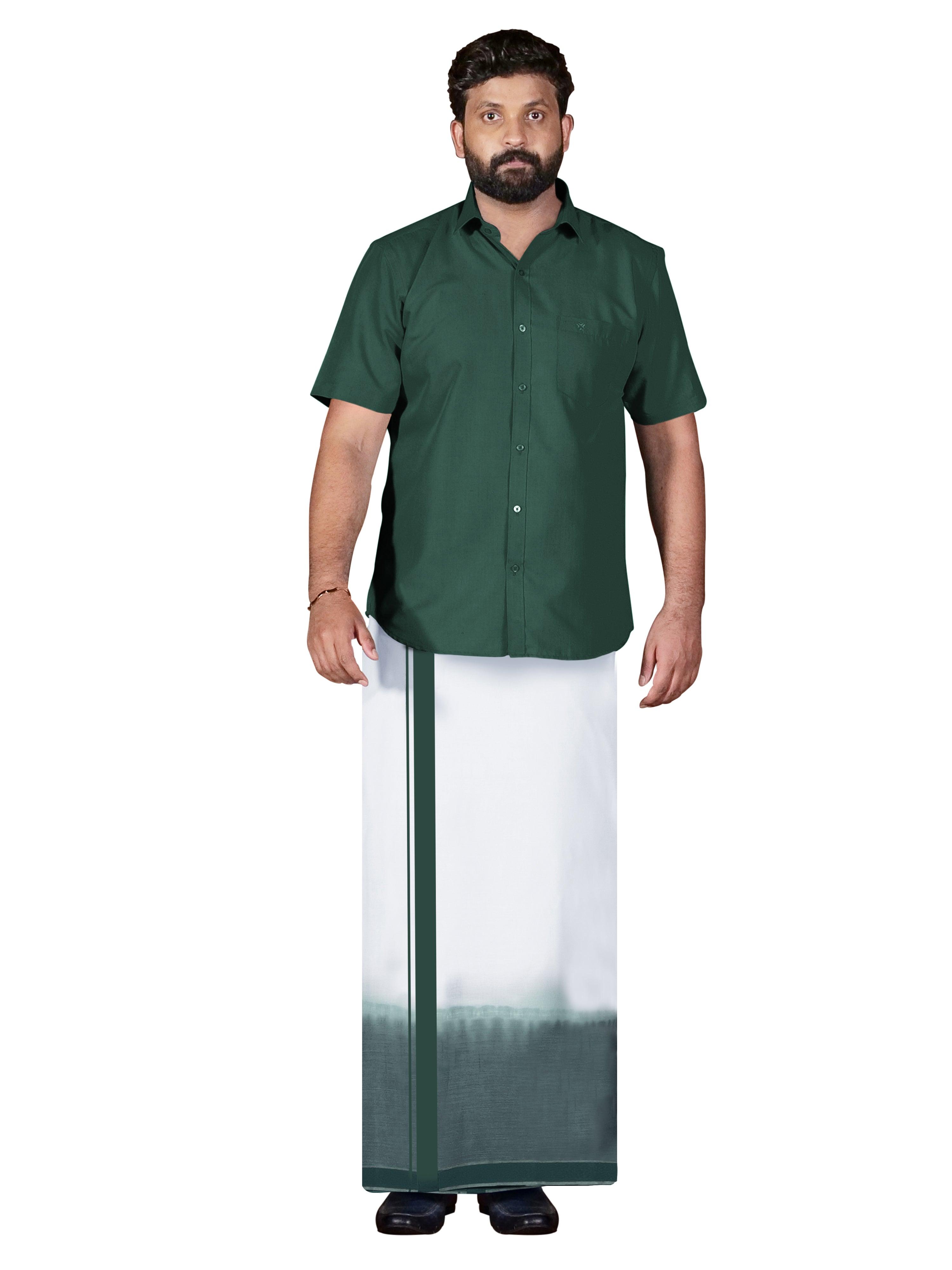 Drape yourself in timeless elegance with our Men's Green Two Tone Dhoti and Half Sleeve Shirt set. Featuring a harmonious blend of hues and impeccable craftsmanship, this ensemble exudes sophistication for any occasion.