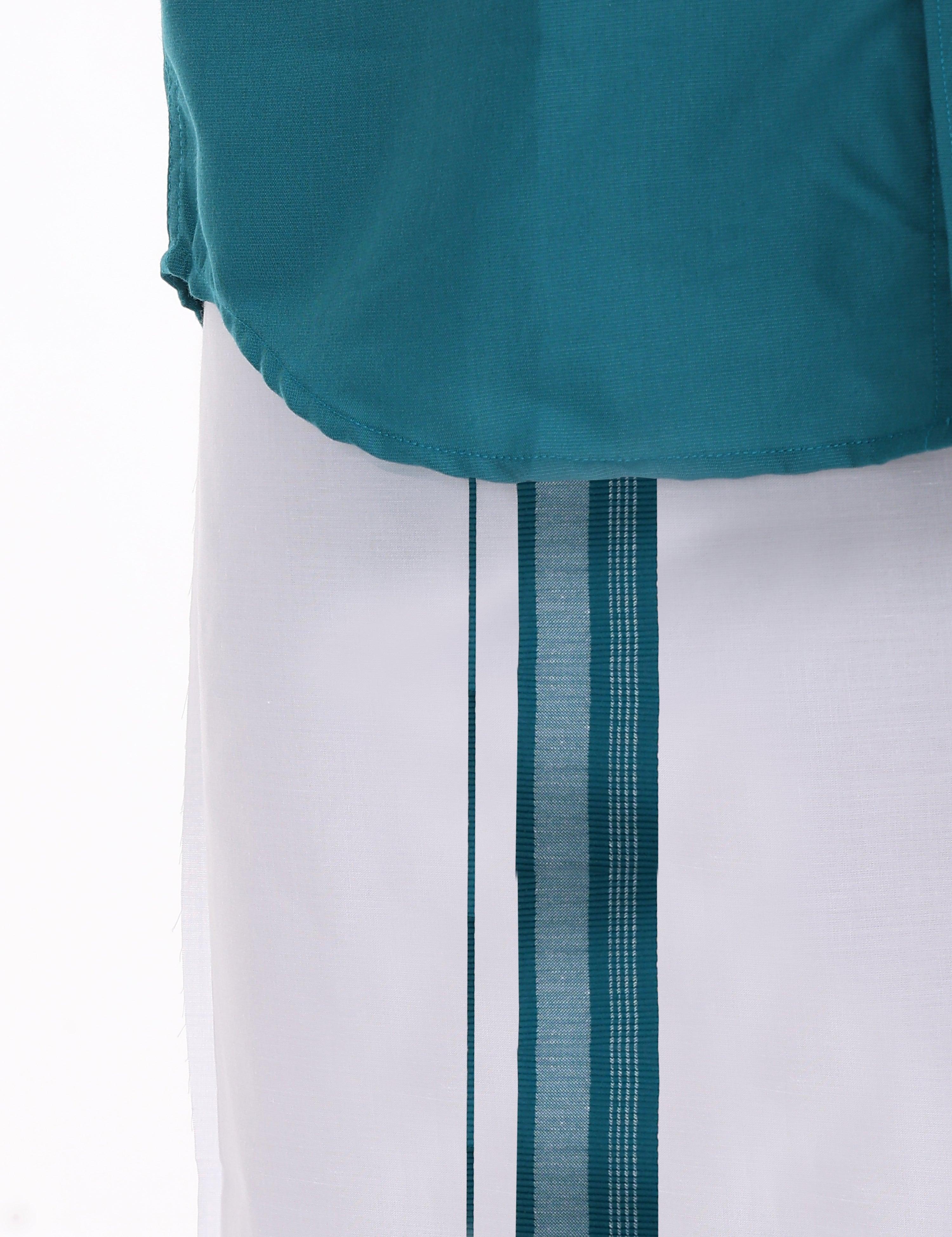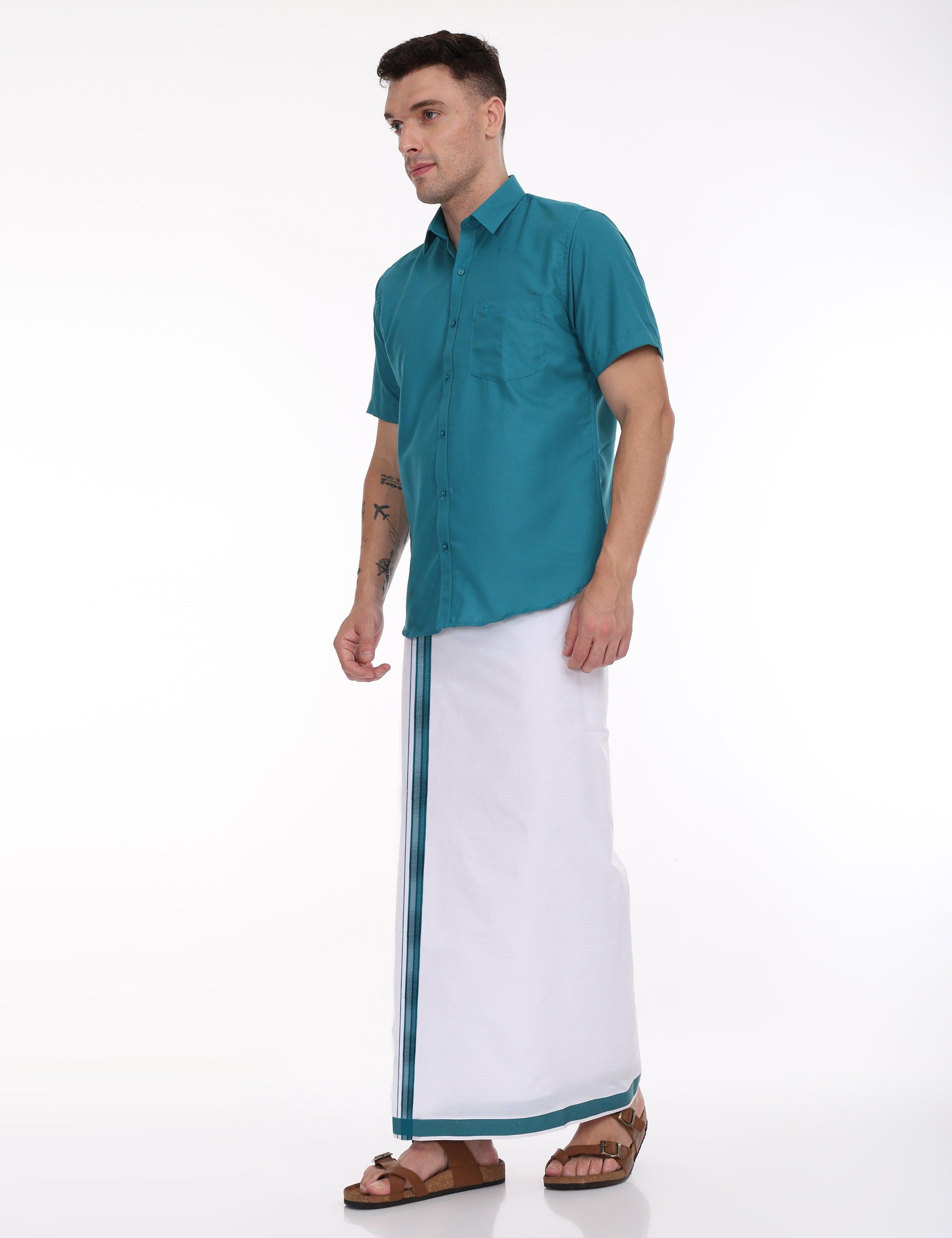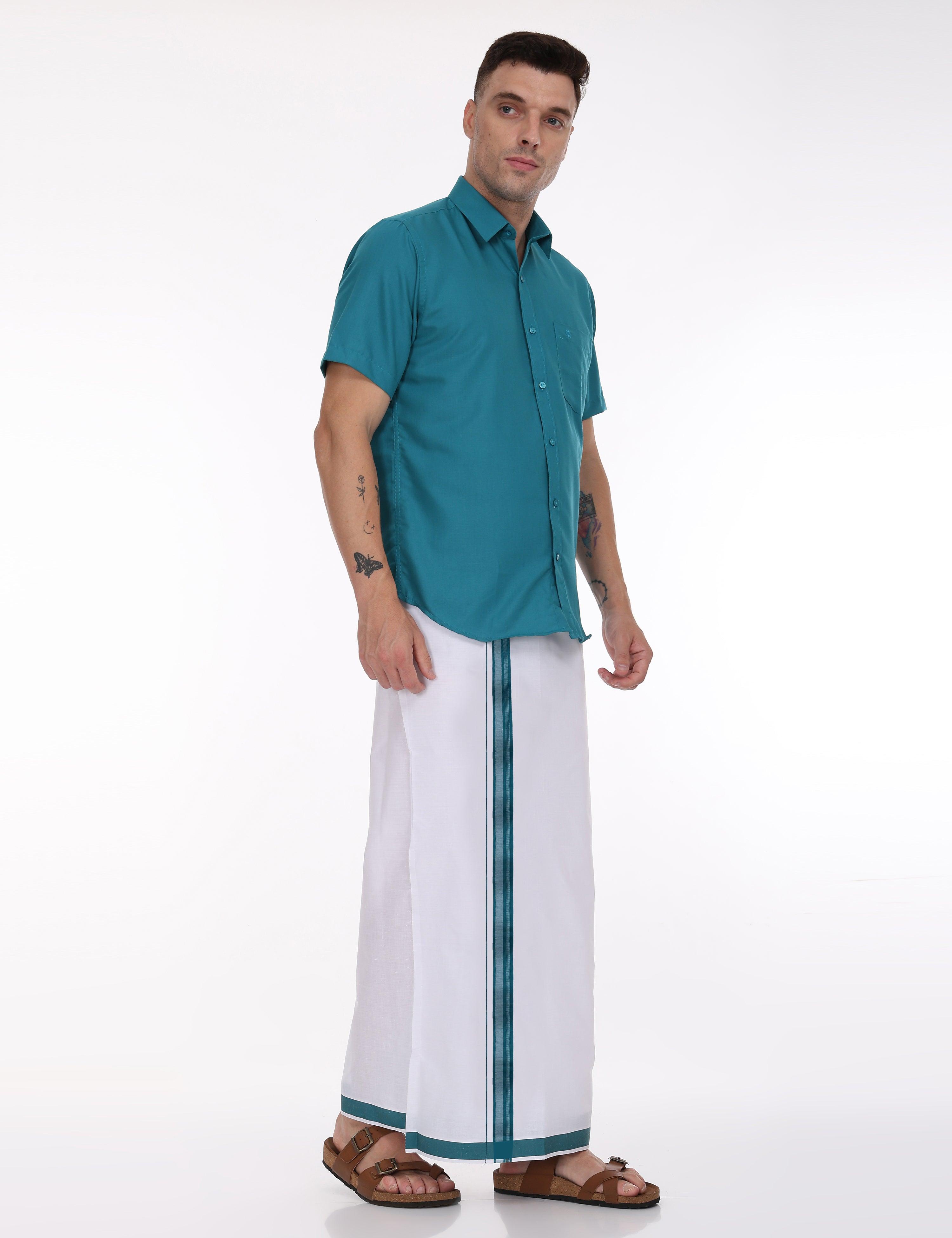 Complete your traditional ensemble with our matching Light Pink Border Dhoti and Half Sleeve Shirt set. Crafted with attention to detail, this ensemble exudes elegance and sophistication, ensuring you stand out at any occasion.